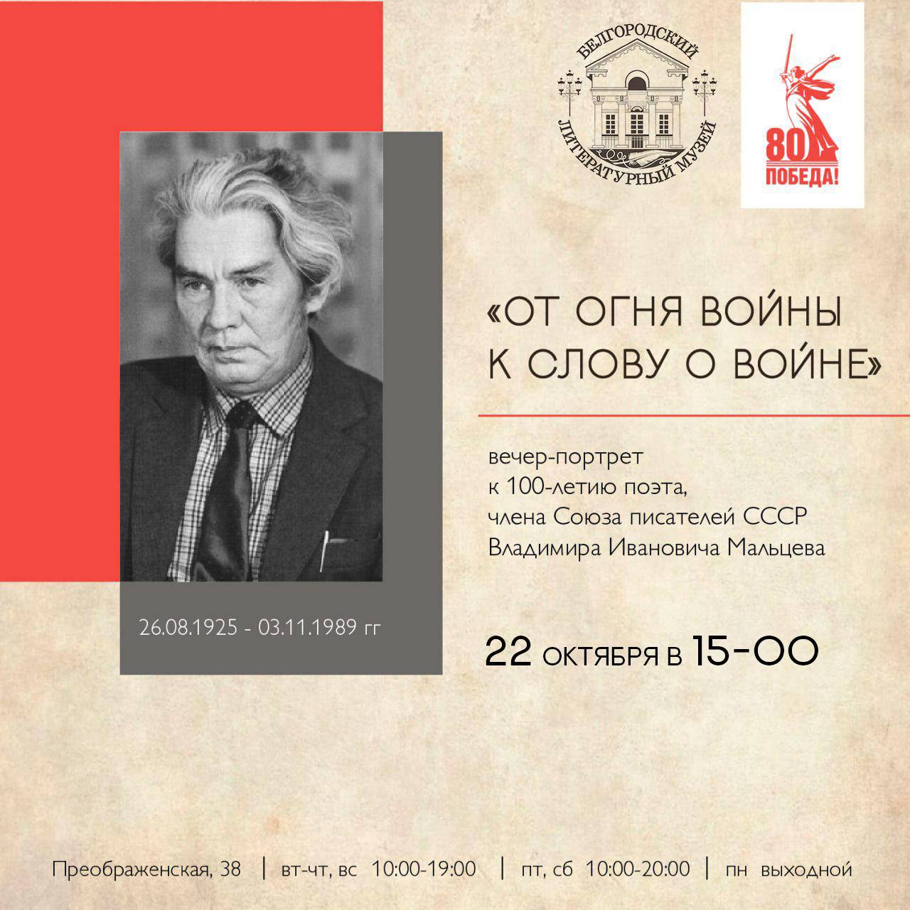 Друзья, приглашаем вас 22 октября в 15:00 на вечер-портрет «От огня войны к слову о войне», посвящённый 100-летию со дня рождения поэта, члена Союза писателей СССР Владимира Ивановича Мальцева