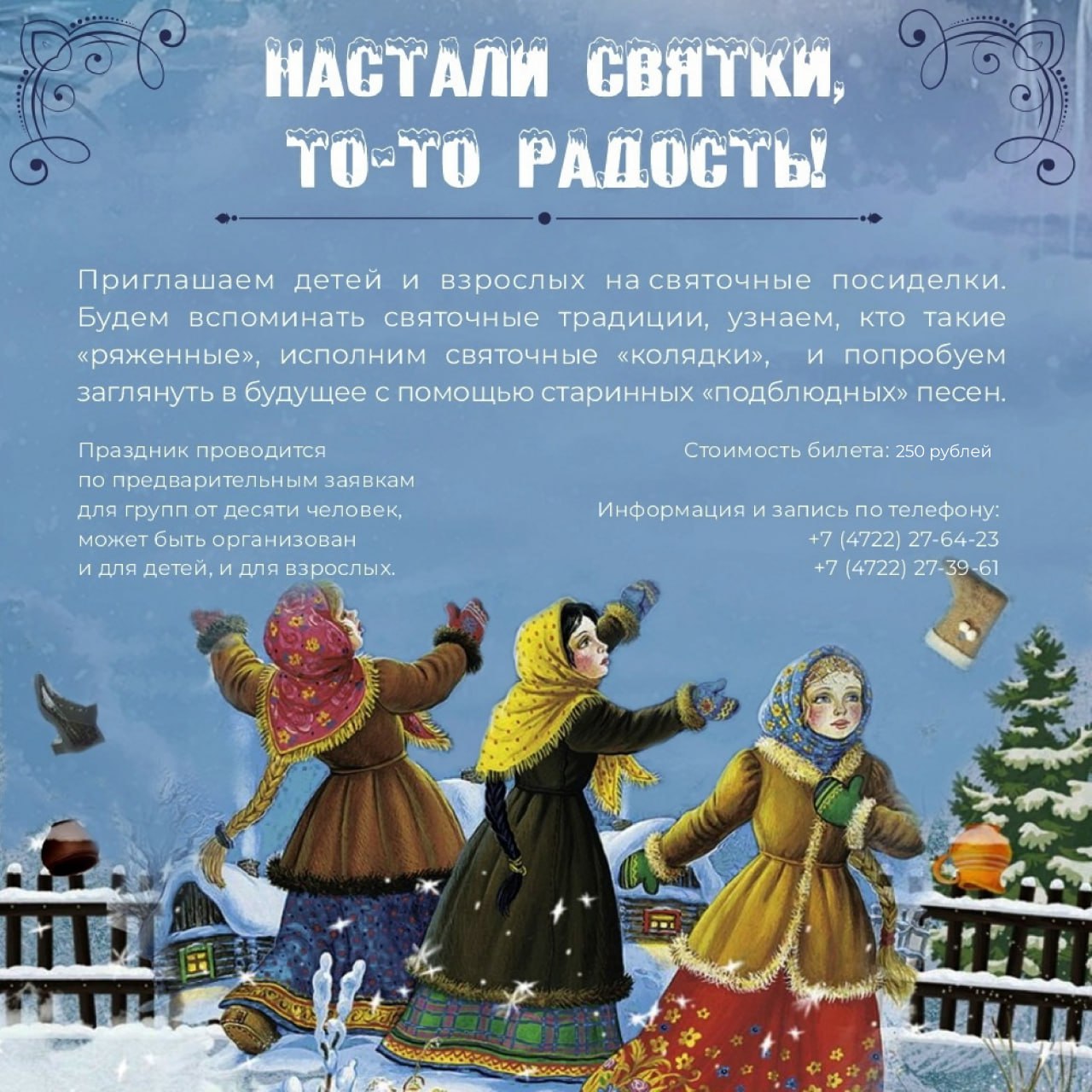 Присоединяйтесь к святочным посиделкам: мы поговорим о святочных традициях, узнаем, кто такие ряженые, исполним святочные колядки и даже попробуем заглянуть в будущее с помощью старинных подблюдных песен.