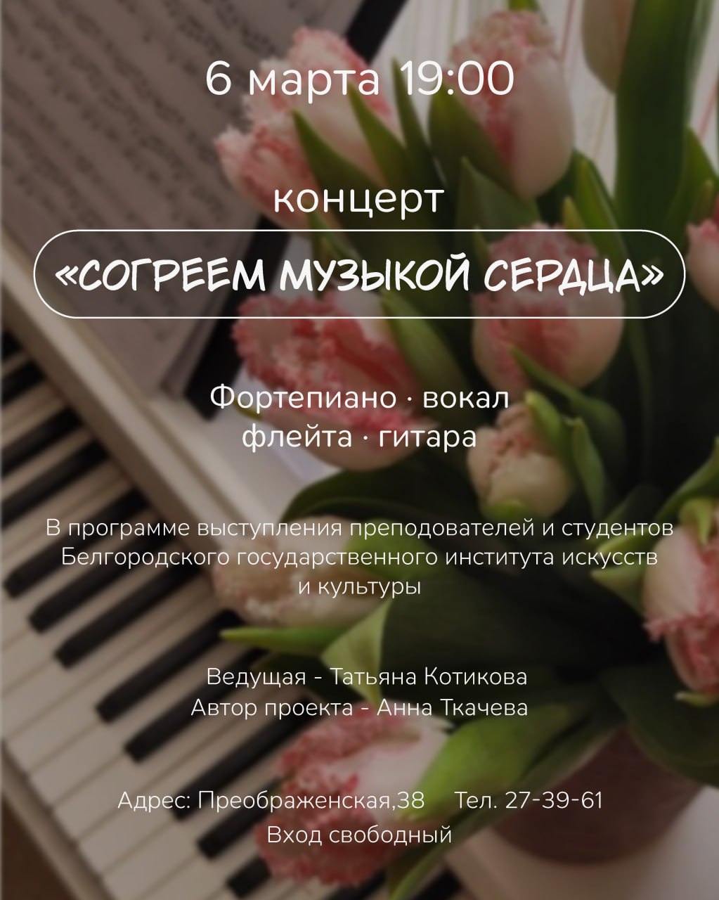 6 марта в 19:00 приглашаем вас на праздничный концерт «Согреем музыкой сердца».